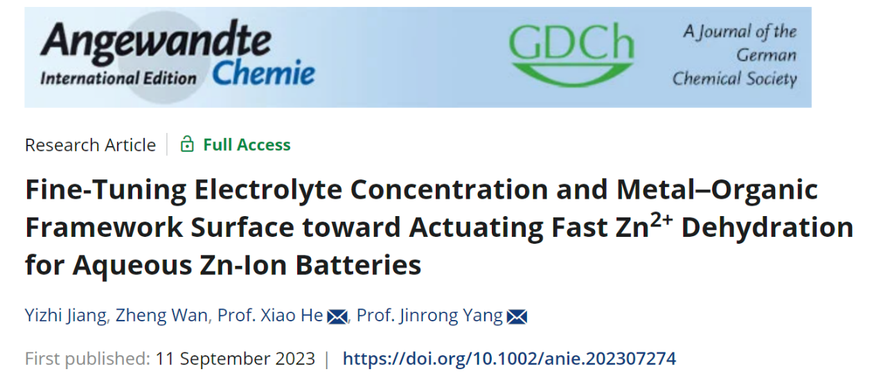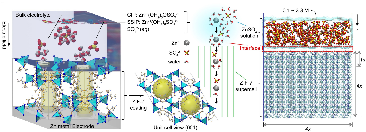 近日,av大平台 的何晓教授和杨金荣副研究员团队聚焦这一底层机制,以ZnSO4电解液和沸石咪唑酯骨架ZIF-7负极保护膜为概念验证,使用理论计算模拟系统探讨了其电解液结构,揭示了溶剂化水合锌离子通过膜层逐步脱水的机理,并据此提出了降低膜厚度至~16 nm和在ZIF-7表面修饰亲水基团来降低脱水,加速锌离子扩散的策略。相关工作在线发表在化学领域顶级期刊《德国应用化学》上(Angew. Chem. Int. Ed. 2023, e202307274),并被评为VIP文章(Very Important Paper)。