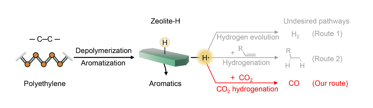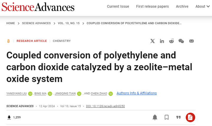 鉴于此,av大平台 赵晨教授研究团队在废弃碳资源塑料和CO2的高价值利用上取得重要进展。构建了沸石-金属氧化物多相催化体系,通过芳构化-氢捕获机制耦合转化废弃聚乙烯与CO2为芳烃和CO。综合多种原位表征、同位标记、模型物的验证等手段,阐释了芳构化-氢捕获的反应机理。相关研究以“Coupled conversion of polyethylene and carbon dioxide catalyzed by a zeolite–metal oxide system”为题,于2024年4月12日发表于Science Advances。