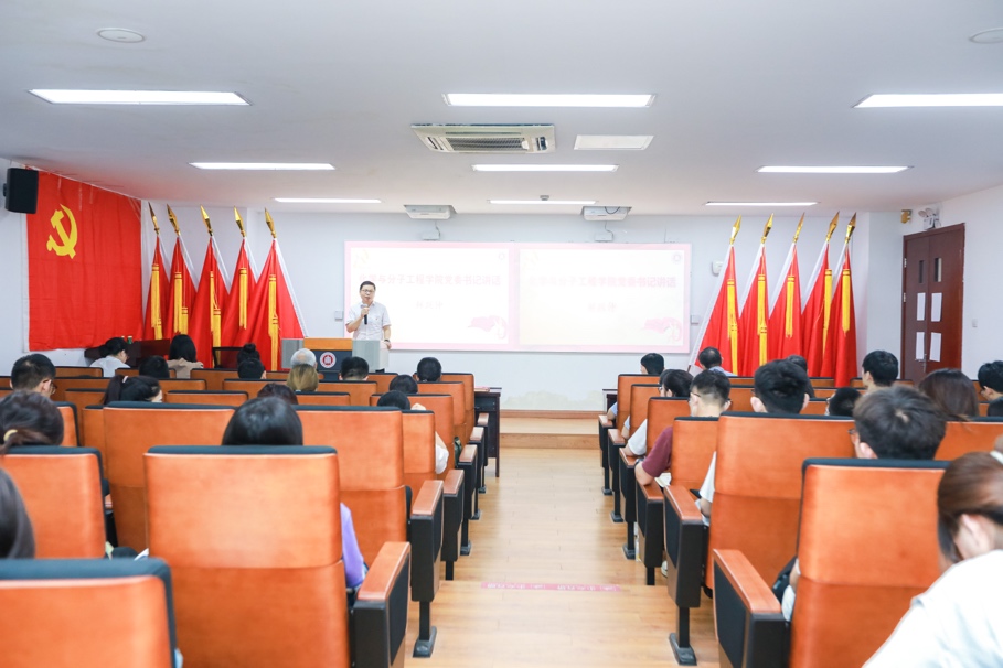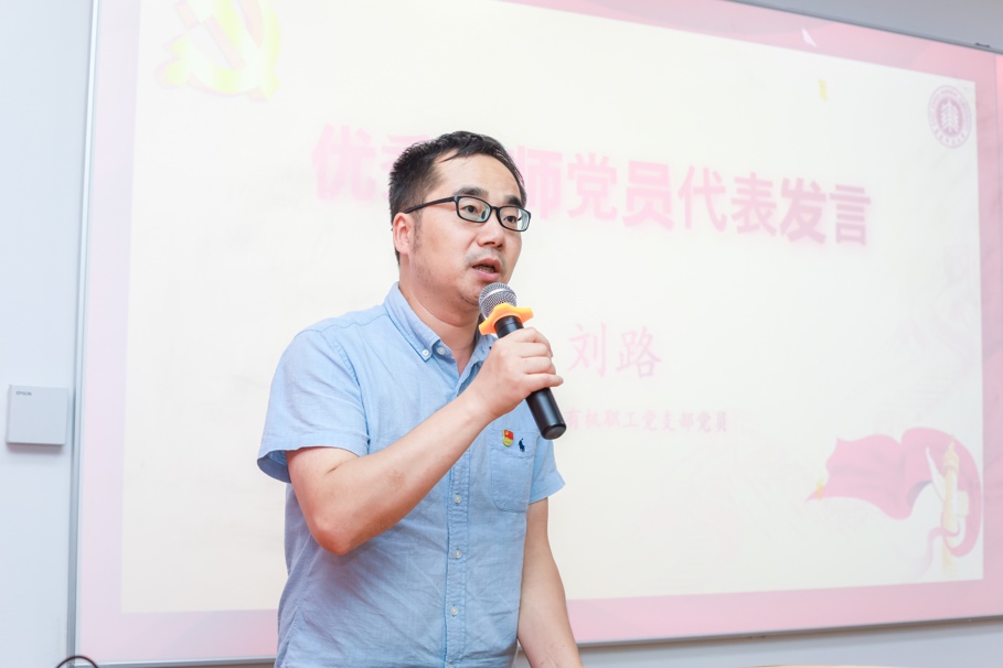 无机有机职工党支部党员教师刘路作为优秀教师共产党员代表发言。刘路老师表达了作为优秀教师共产党员要做表率的决心,表示要牢记“立德树人”使命,向前辈学习,立足岗位,扎实推进科研和教学工作,为“建教育强国,以教育强国”的光荣事业贡献力量。