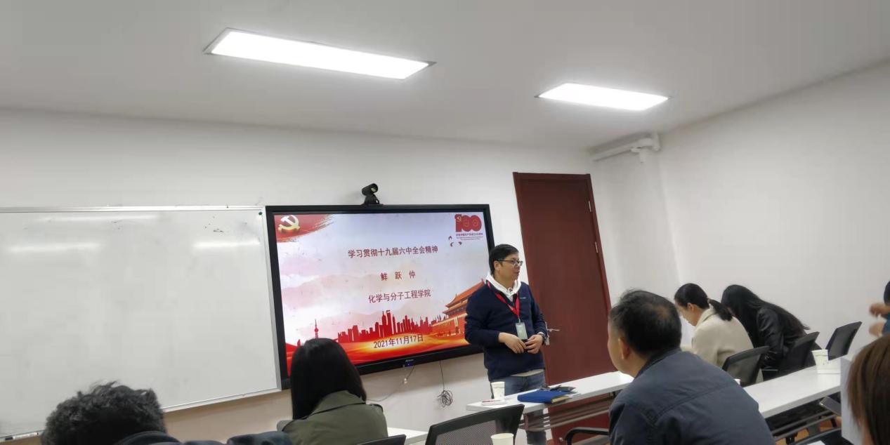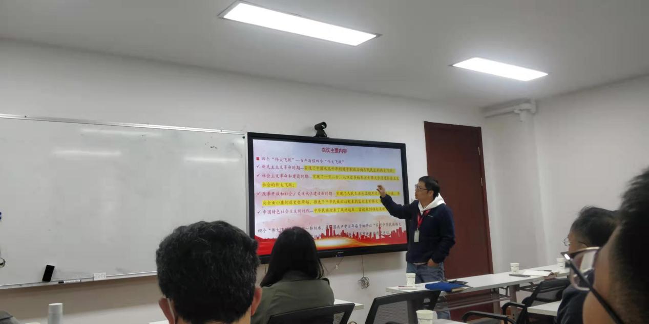首先,鲜跃仲作了题为《学习贯彻十九届六中全会精神》的专题报告。向与会师生介绍了十九届六中全会的概况并详细讲解了党历史上三次历史决议的背景,特别强调了党的十九届六中全会作出的《中共中央关于党的百年奋斗伟大成就与历史经验的决议》的作用不是为了解决历史问题上的思想分歧,而是在建党百年及开启全面建设社会主义现代化国家的关键时间节点,通过总结建党百年取得的重大成就和历史经验,“看清楚过去我们为什么能够成功,弄明白未来我们怎样才能继续成功”,从而推动全党统一思想、统一意志、统一行动,以史为鉴、砥砺奋进,在向第二个百年奋斗新目标迈进的新征程上有新作为。为了更好把握六中全会精神,鲜跃仲用“一条主线、两个确立、三个需要、四个时期、五个意义、十个坚持”对全会形成的决议内容进行了梳理总结。鲜跃仲认为决议作为一篇马克思主义的纲领性文献,必将成为实现中华民族伟大复兴的行动指南,也将指导我们树牢“四个意识”、坚定“四个自信”、做到“两个维护”,立足新发展阶段,凝心聚力,勇于担当,奋进作为,答好新赶考路上的新答卷。同时,鲜跃仲要求各支部要紧密结合党史学习教育,深入开展十九届六中全会精神学习,特别是要将全会精神学习与推动工作紧密结合,促进学院事业更高质量发展。