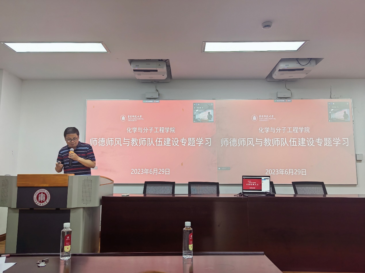 为进一步加强师德师风建设,规范教师职业行为,弘扬爱岗敬业、为人师表的美德,6月29日下午,av大平台 党委于闵行校区化学楼135报告厅,同时与普陀校区化学馆A205连线,开展学院师德集中学习教育,学院全体教师出席会议。党委书记鲜跃仲对进一步强化师德师风建设进行宣讲领学,院长田阳对进一步加强全院师德师风建设提出工作要求。