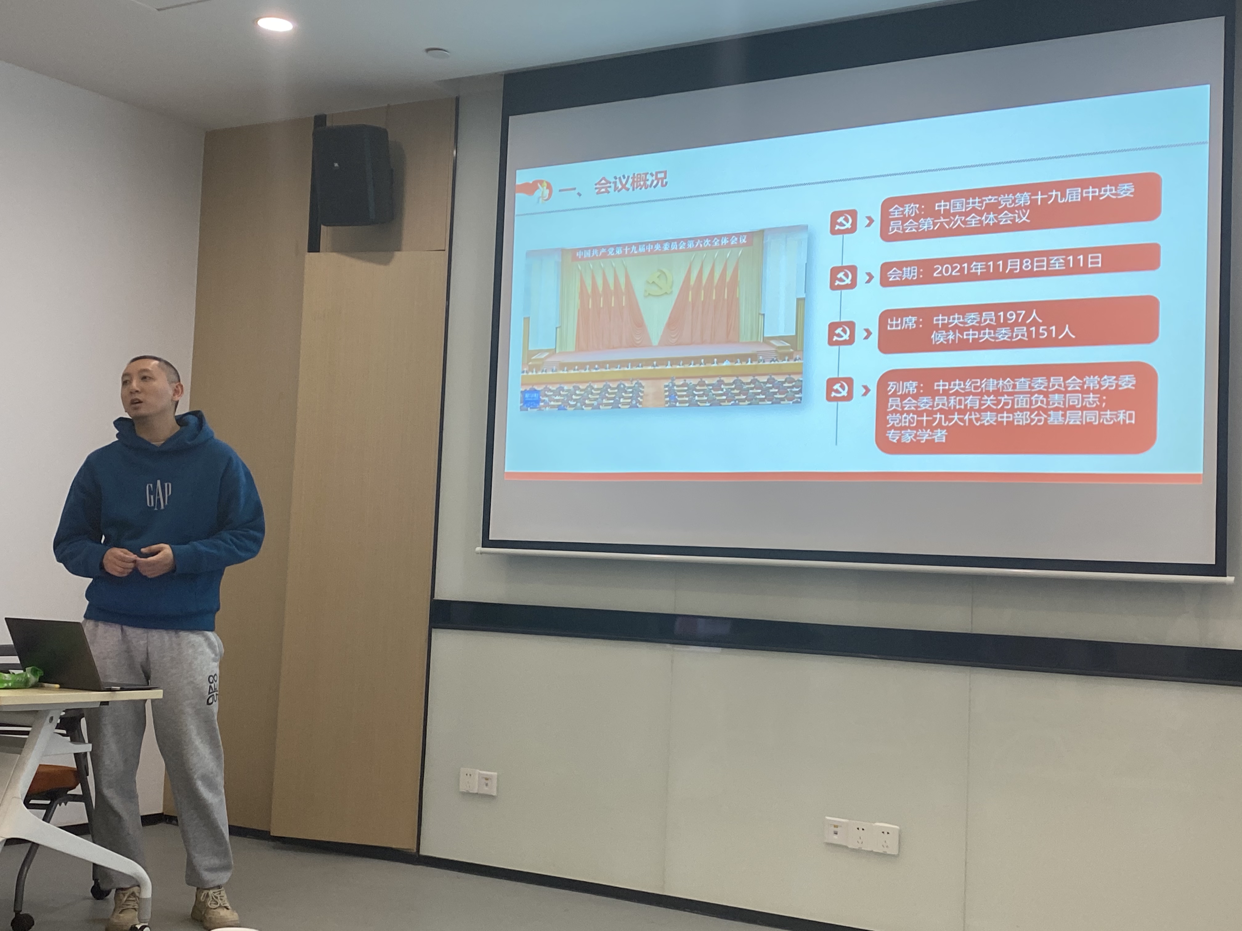 随后,王梦雅、张亮老师带领全体与会党员详细学习了解了十九届六中全会通过的《中共中央关于党的百年奋斗重大成就和历史经验的决议》。张老师首先从会期、会议内容等方面对十九届六中全会作简要介绍,指出这是我们党百年华诞的重要时刻,在“两个一百年”奋斗目标历史交汇关键节点上召开的一次重要会议。随后,张老师从“一条主线”“两个确立”“三个需要”“四个时期”“十三个方面”“四个‘伟大飞跃’”“五方面意义”“十个坚持”等方面对决议进行概况介绍和详细解读,并针对如何深刻认识全会从五个方面指出中国共产党百年奋斗的历史意义这一问题进行了详细介绍,还为大家推荐了相关学习资料。张老师强调,全体党员要自觉深化学习、领会精神,学深悟透十九届六中全会精神,坚定理想信念,牢记初心使命,以史为鉴、开创未来,埋头苦干、勇毅前行,在初心坚守和使命担当中,汲取接续奋进动力、激发改革创新活力、增强干事创业能力。