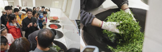 接着,老师们来到国际级碧螺春技艺非遗传承人施跃文老师的工作坊,现场观看了经摊晾后的碧螺春如何杀青、揉捻。只见施老师的徒弟在一口大锅中,不停地徒手翻炒茶叶,不能间断,至少要持续1小时。茶叶的由来充满了师傅的辛勤汗水,得之不易。特别一提的是,施老师的徒弟要先从添柴烧火做起,至少要烧3年方能进入杀青环节。“炒1斤高级碧螺春要7万颗芽头!”“炒制碧螺春要做到手不离茶,茶不离锅,揉中带炒,炒揉结合。”“炒茶,七分烧火三分炒,不会烧火,就不能掌握火候和温度。”老师们在品鉴碧螺春的时候,由衷感慨:正是有了一代代技术精湛的民间技艺传承人,“茶中仙子”碧螺春方能延续千年。