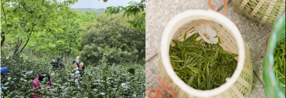在从上海到东山的大巴上,老师们一起学唱采茶歌,其乐融融,近2个小时的车程一晃而过,转眼来到洞庭山碧螺春群体小叶种种植示范基地。在茶农老师的讲解和指导下,老师们学习了茶树树种知识,了解茶叶一芽一叶、一芽二叶的鉴别。戴上头巾,老师们在山里亲手采摘茶叶,一会就熟练起来,每个人的竹篓里都是满满的茶叶,手捧茶叶,清香扑鼻而来,在山里闻一缕茶叶香,真是心旷神怡啊!