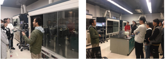 见面会后,在研究院宋翔老师和熊锋老师的带领下,师生们参观了公司的表征分析部和分子筛高通量实验室。在表征分析部,相关负责人向同学们详细介绍了各类先进的分析表征仪器并就同学们提出的问题给予了耐心解答。随后,在校友王振东学长的带领下,师生们还参观了公司的分子筛高通量实验室,在这里,校友付文华学长向同学们详细介绍了高通量水热合成装置,自动化实验过程的实现,展现了研究院在提高科研效率方面的创新,同学们就装置的原理和构造问题,也和学长进行了进一步的探讨。