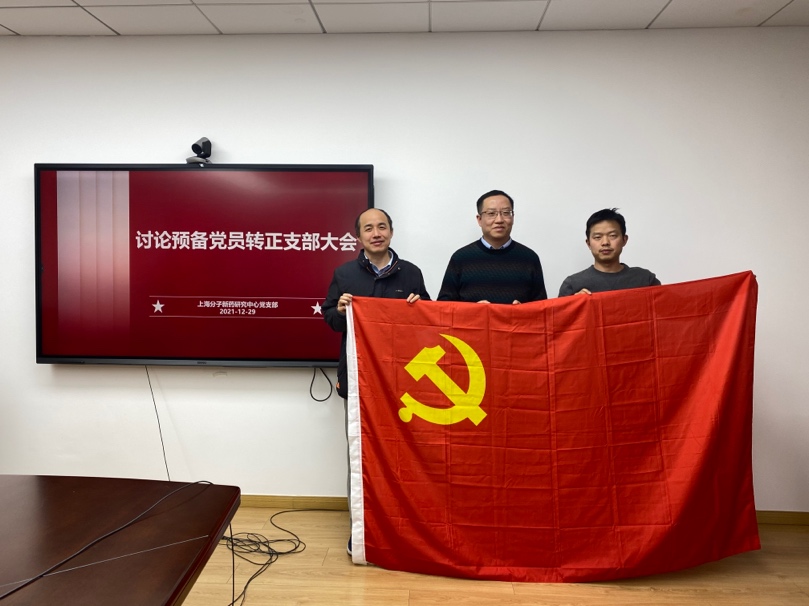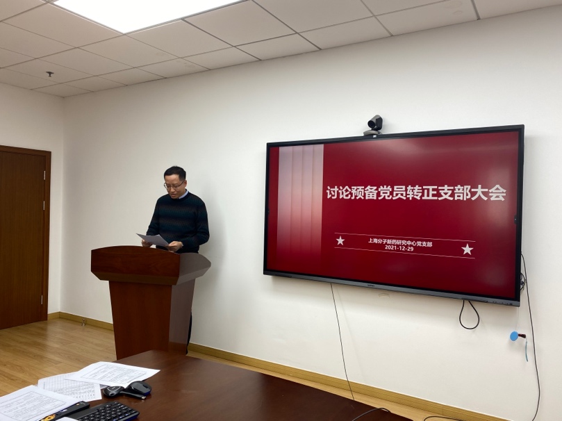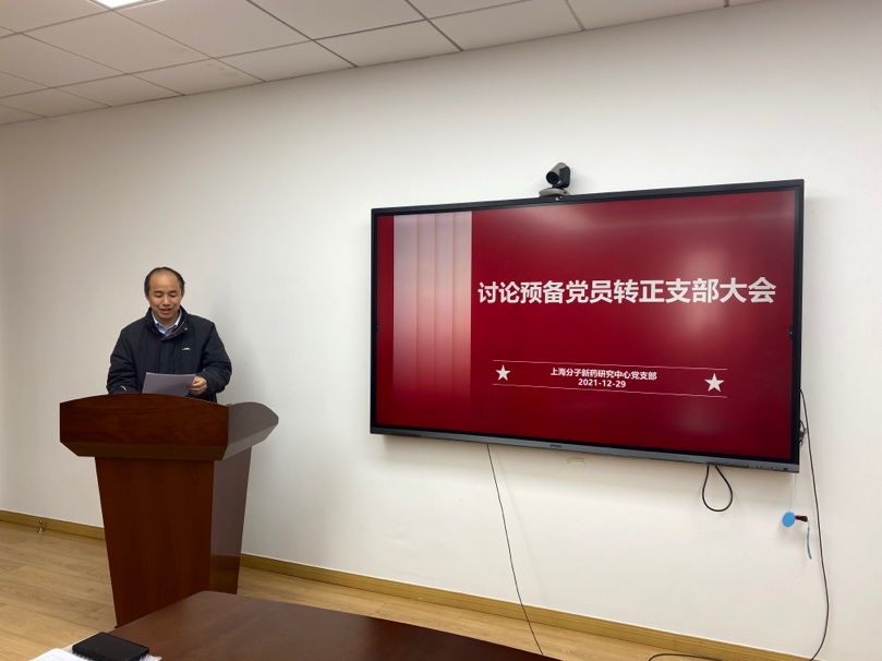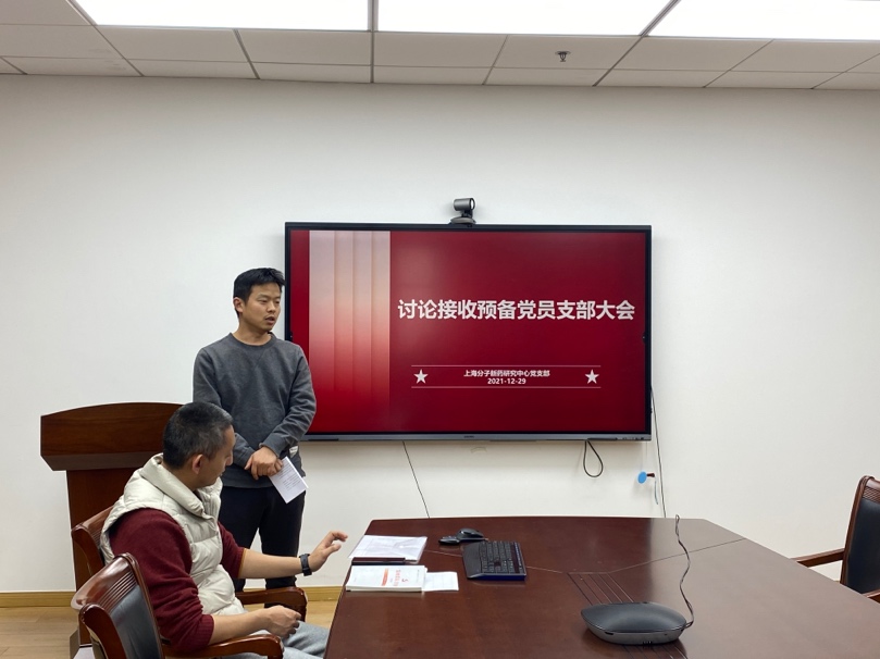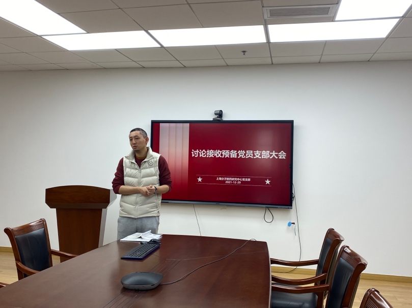 20211229日,上海分子新药研究中心党支部在理科大楼B1602会议室召开支部大会,讨论接收预备党员和预备党员转正事宜。本次党员大会应到会具有表决权的正式党员26人,因事因病请假2人,实到会具有表决权的正式党员24人,有表决权的到会人数超过应到会有表决权人数的半数,符合程序规定。大会由支部书记张亮主持。