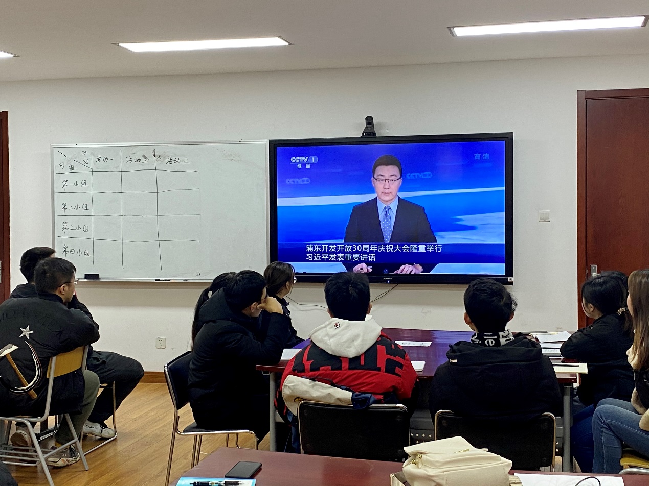樊梦婷播放了习近平总书记在浦东开发开放30周年庆祝大会的重要讲话的视频。总书记强调,站在新的历史起点上,而立之年的浦东要有大局观,在更大的历史进程中谋划自身发展,乘势而上,深化改革,继续做好开路先锋、当好排头兵,承担好时代赋予的新使命。抓住历史机遇、开启发展新局,要全力做强创新引擎,加强改革系统集成,深入推进高水平制度型开放,增强全球资源配置能力,提高城市治理现代化水平,筑就改革创新新高地,塑造人民城市新典范。樊梦婷总结了讲话精神,解释了浦东开发开放30年取得的显著成就为中国特色社会主义制度优势提供了最鲜活的现实明证,也为改革开放和社会主义现代化建设提供了最生动的实践写照。