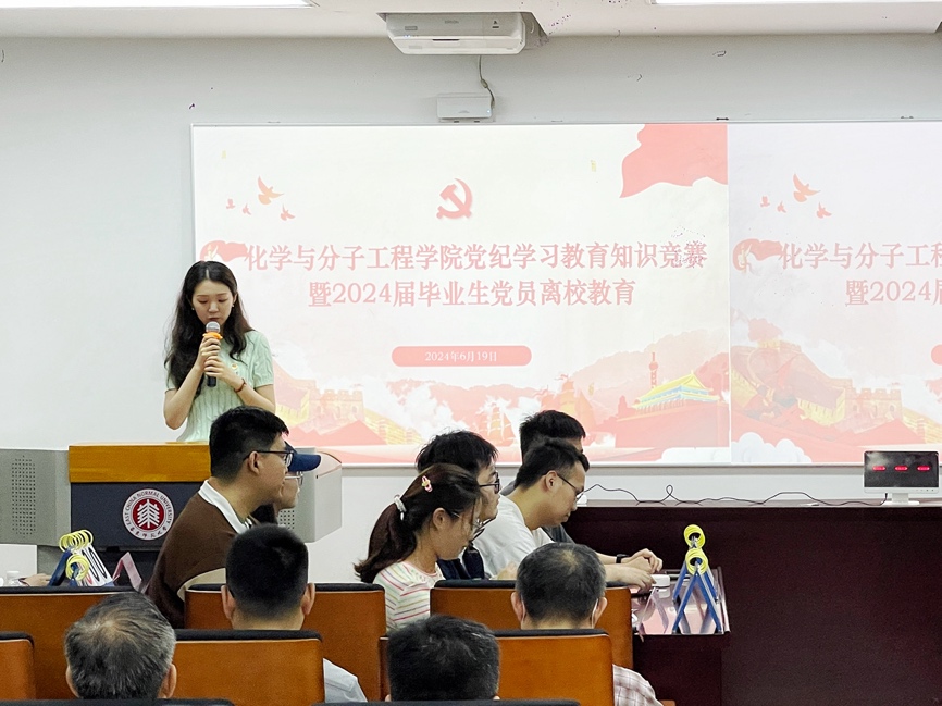 在党纪学习教育知识竞赛后,随之进行了2024届毕业生党员离校教育,旨在引导毕业生党员们铭记党的教诲,坚定理想信念,以更加饱满的热情投入到未来的学业、工作和生活中去。会议由院党委副书记王婷婷主持。