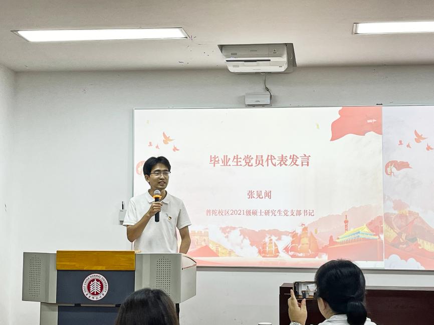 毕业生党员代表、普陀校区2021级硕士研究生党支部书记张见闻回忆了自己在校的学习与成长生涯,表明今后继续恪守校训精神以及努力回报母校与社会的决心。