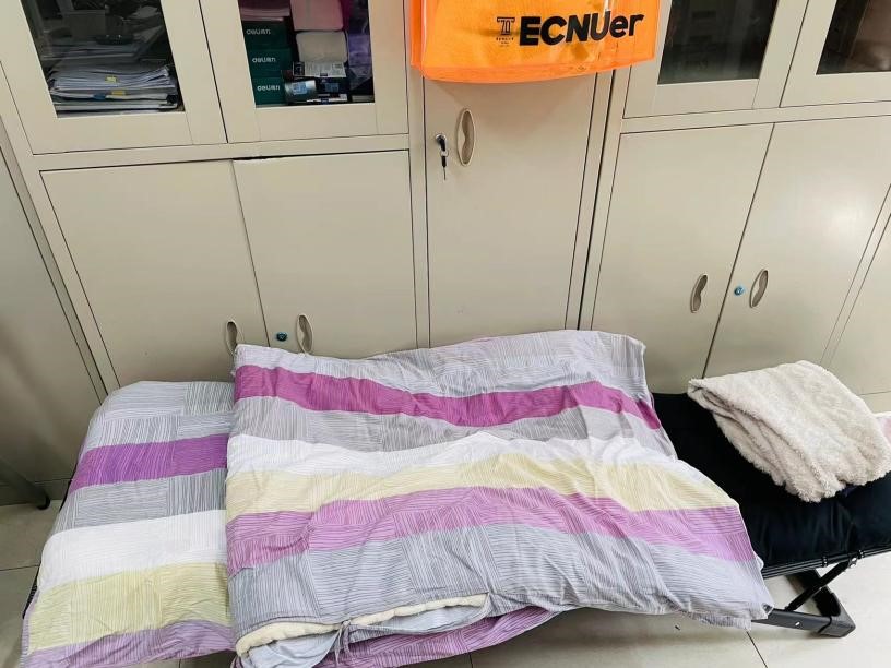 除了通过深夜电台对学生及时进行心理疏导外,她同时还承担着化学院学生核酸检测监督员、做好疫情防控期间闵行化学楼里的师生服务(为封控在宿舍楼里的同学解决燃眉之急)、及时发布学校和闵行区的疫情防控动态、在学工团队的指导下解决疫情防控期间闵行校区的各类学生危机事件等工作。冯老师舍小家为大家,在办公室安个小家。