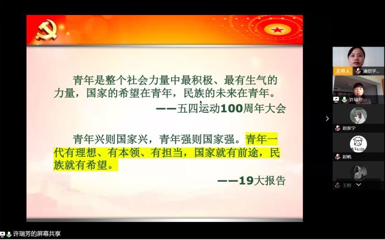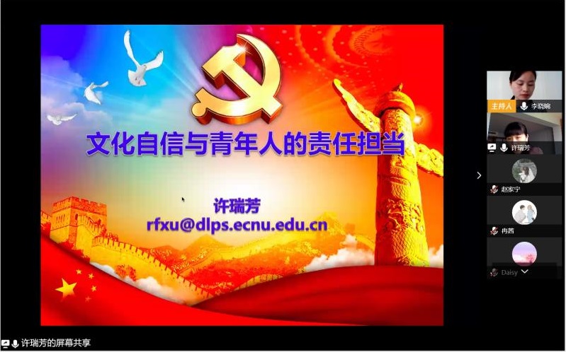 2020年4月25日上午,av大平台 党委、物理与电子科学学院党委、通信与电子工程学院党委、数学科学学院党委、哲学系党委、生态与环境科学学院党委、河口海岸科学研究院和河口海岸学国家重点实验室党委第一期入党积极分子联合党校培训班第三场专题党课在线上顺利开课,马克思主义学院副院长许瑞芳老师受邀主讲《文化自信与青年人的责任担当》,各学院共238名入党积极分子参加了此次培训学习。