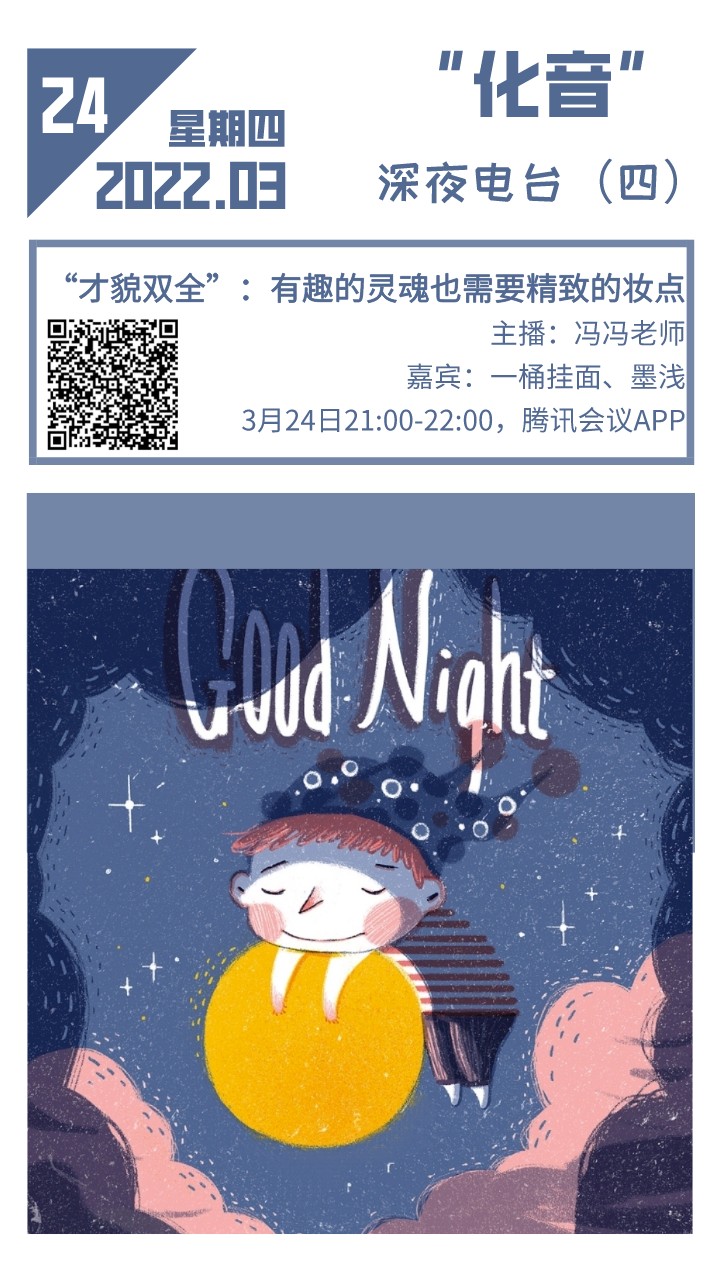 3249:00点,“化音”深夜电台第四期)与大家再次相见。本期以“‘才貌双全’:有趣的灵魂也需要精致的妆点”为主题,邀请了“墨浅”“一桶挂面”(昵称)两位嘉宾,与主播冯冯老师共同讨论关于护肤、美妆、穿搭的秘诀,以及个人外在形象与内在涵养的统一关系。