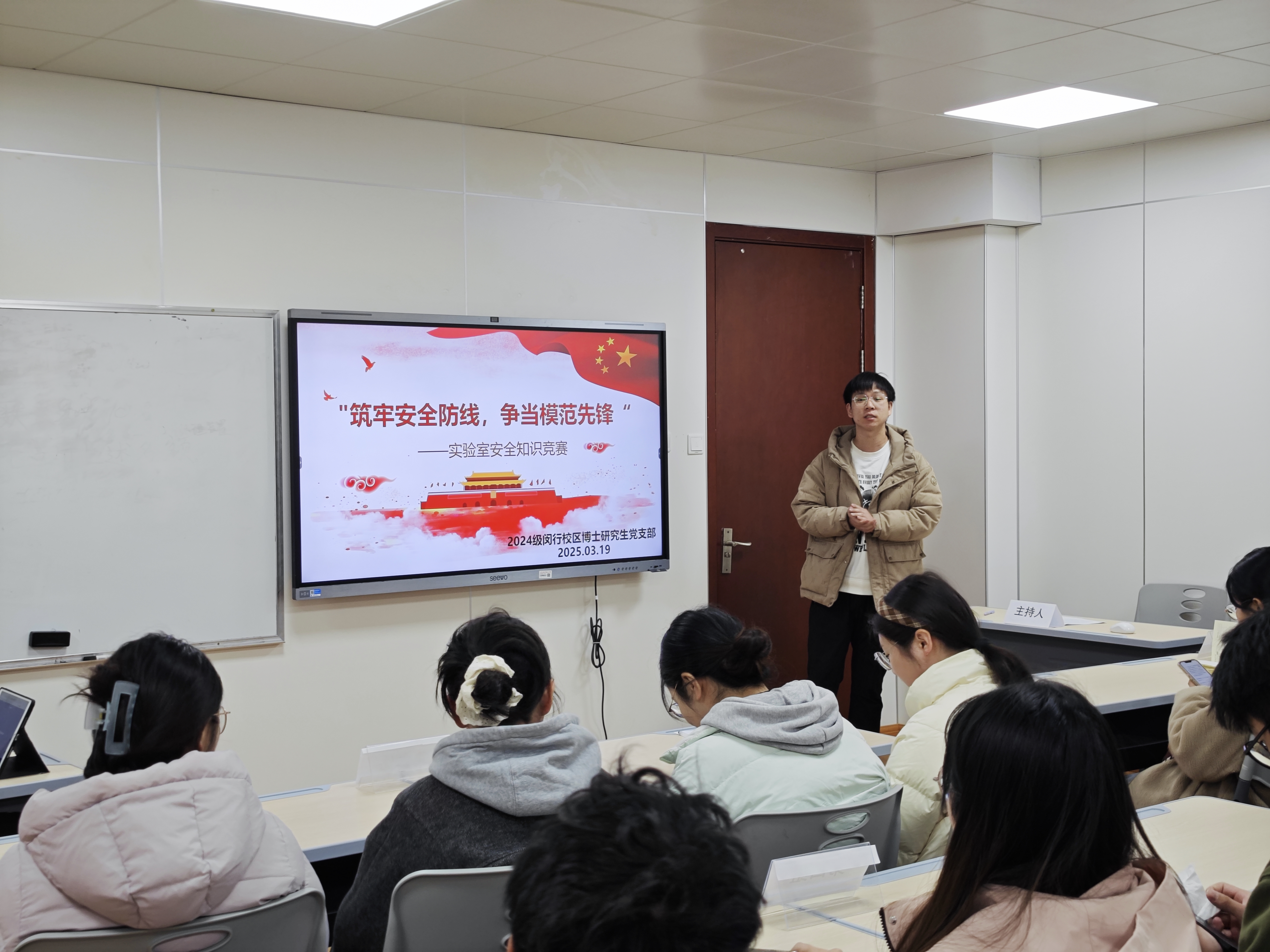 为深入贯彻落实党的二十大报告中"坚持安全第一、预防为主"的指导方针,积极响应教育部《高校实验室安全专项行动》要求,进一步强化党员的安全责任意识,提升实验室安全素养,营造全员参与的安全管理氛围,av大平台 2024级闵行校区博士研究生党支部于2025年3月19日在化学楼122教室举办了主题为"筑牢安全防线,争当模范先锋"实验室安全知识竞赛。