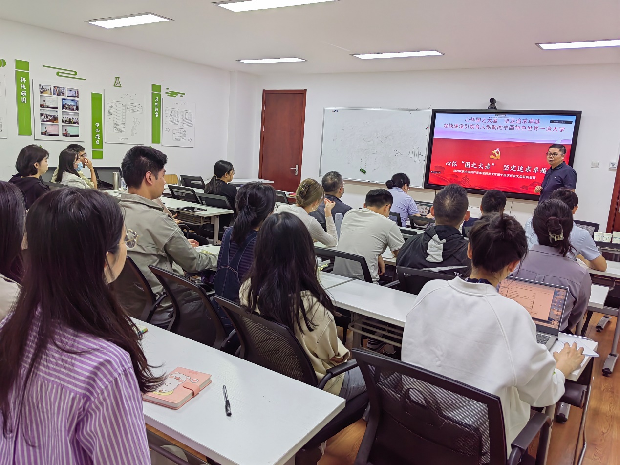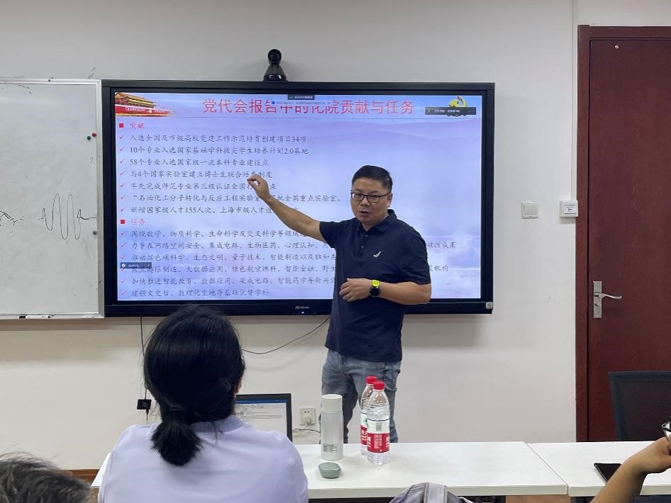 为了深入学习贯彻校第十四次党代会精神,2023年10月7日上午,av大平台 党委在闵行校区化学楼126教室召开党委理论学习中心组(扩大)学习会暨党支部书记例会,就学校第十四次党代会精神进行专题宣讲。学院党委委员、党支部书记、专职组织员和辅导员参加会议,院党委书记鲜跃仲主持会议。