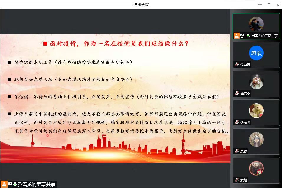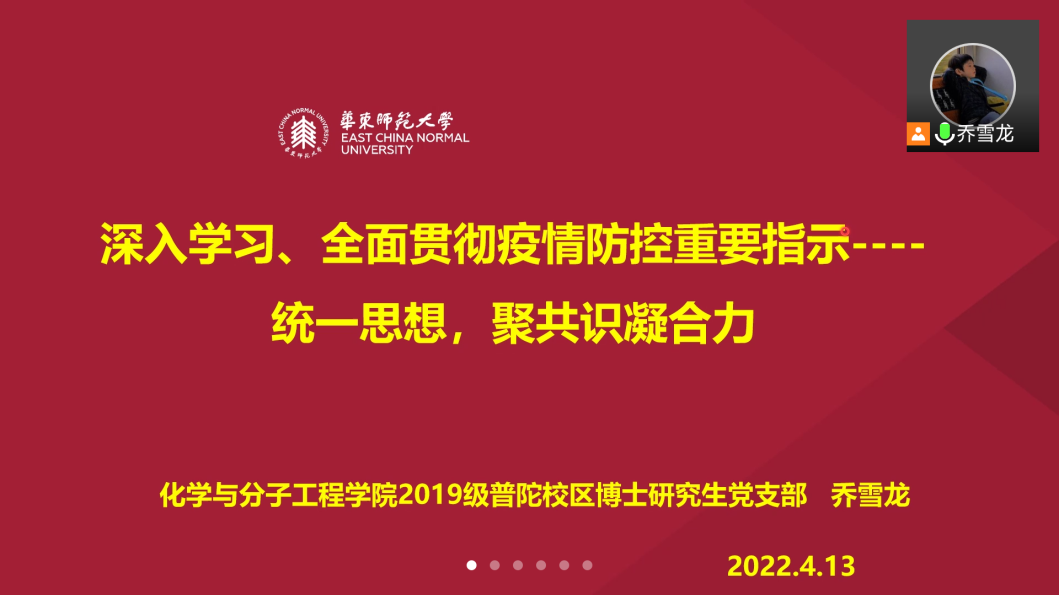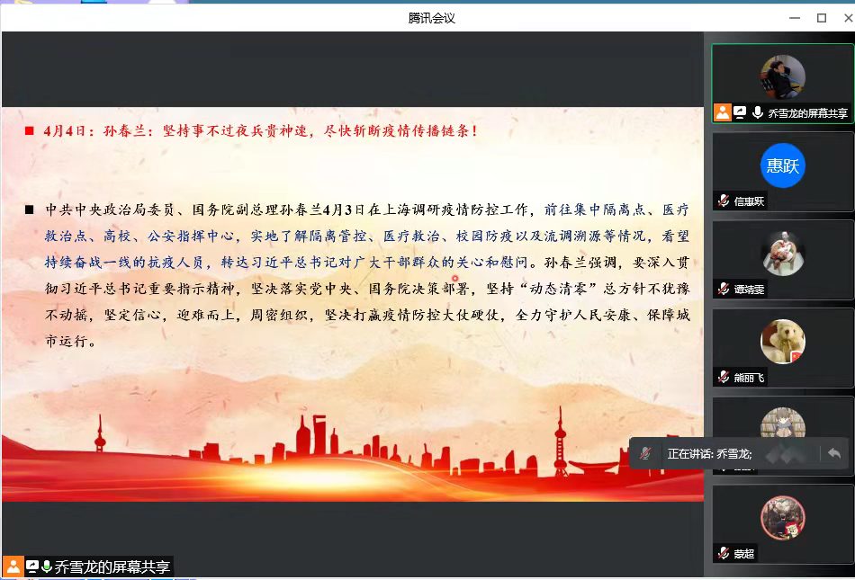 为进一步做好疫情防控工作,4月13日下午,av大平台 通过腾讯会议线上开展了主题为“深入学习、全面贯彻疫情防控重要指示”的党日活动,组织全体党员同志深入学习、全面贯彻落实习近平总书记关于疫情防控的重要指示精神,全面掌握当前上海市疫情防控新形势、新任务、新要求。会议由2019级普陀校区博士研究生党支部书记乔雪龙主持。