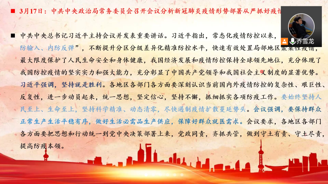 会议的第一部分,乔雪龙同志带领大家认真学习了习近平总书记在中央政治局常务委员会会议上的重要讲话精神。习近平总书记有关疫情防控工作的重要指示统揽全局、切中要害,为我们战胜疫情、夺取最终胜利提供了强大动力、工作指南和根本遵循。应当切实把思想和行动统一到习近平总书记重要指示精神上来,始终坚持人民至上、生命至上,坚持科学精准、动态清零,要求各地区各部门各方面要把思想和行动统一到党中央决策部署上来,党政同责,齐抓共管,做到守土有责、守土尽责,提高防疫本领。