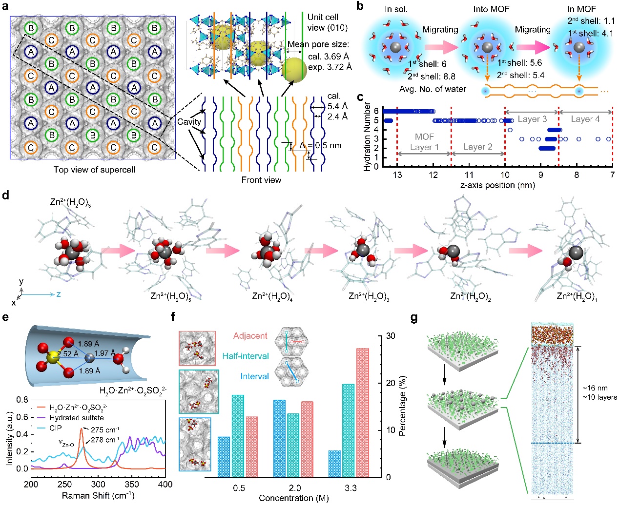 近日,av大平台 的何晓教授和杨金荣副研究员团队聚焦这一底层机制,以ZnSO4电解液和沸石咪唑酯骨架ZIF-7负极保护膜为概念验证,使用理论计算模拟系统探讨了其电解液结构,揭示了溶剂化水合锌离子通过膜层逐步脱水的机理,并据此提出了降低膜厚度至~16 nm和在ZIF-7表面修饰亲水基团来降低脱水,加速锌离子扩散的策略。相关工作在线发表在化学领域顶级期刊《德国应用化学》上(Angew. Chem. Int. Ed. 2023, e202307274),并被评为VIP文章(Very Important Paper)。