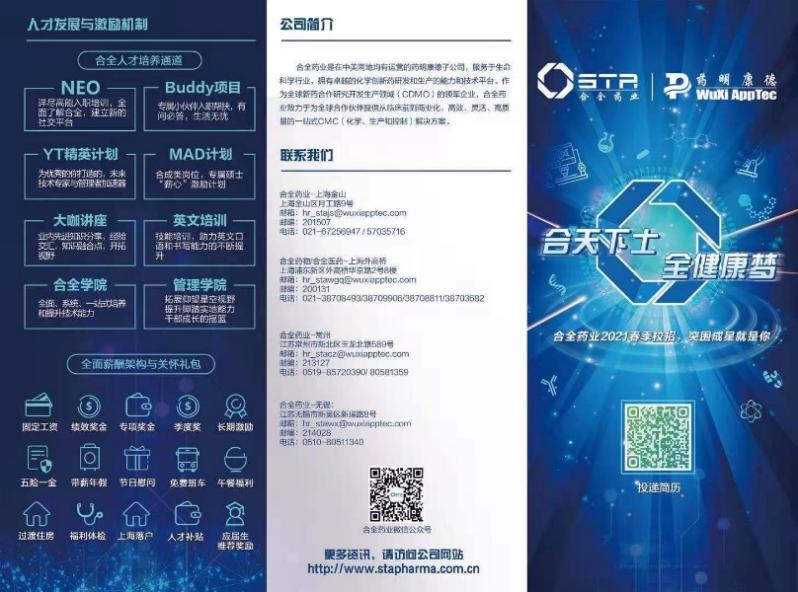 上海合全药业有限公司系上海药明康德新药开发有限公司全资控股子公司,成立于2003年1月,位于上海金山。合全药业是在中美两地均有运营的药明康德子公司,服务于生命科学行业,拥有卓越的化学创新药研发和生产的能力和技术平台。作为全球新药合作研究开发生产领域(CDMO)的领军企业,合全药业致力于为全球合作伙伴提供从原料药(API)到制剂,高效、灵活、高质量的一站式解决方案。通过人事老师的展示和讲解,同学们对该公司有了更为全面的了解和认识。