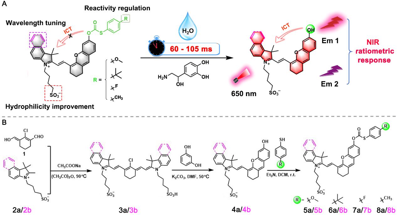 此前,av大平台 田阳教授团队已经成功开发了一种百毫秒级快速响应的小分子荧光探针,通过对反应过渡态和探针分子构象的双重调控实现了对NE的百毫秒级快速检测(Nat. Commun. 2023, 14, 1419)。在此基础上,团队近期对探针结构进行了进一步的设计和优化,开发了一系列新型的近红外激发有机荧光探针分子(图1),通过水分子催化效应和取代基效应的双重调控,成功地将NE的响应时间进一步缩短至60毫秒,这是目前报导的对NE响应速度最快的小分子荧光探针。此外,该探针具有高特异性、高灵敏度,以及近红外比率型响应性能,从而实现了在神经元、脑切片和活体鼠脑等不同层次、不同区域中NE的快速、精准定量荧光成像,成果在线发表在《美国化学会志》(J. Am. Chem. Soc., 2023, DOI: 10.1021/jacs.3c09239)上。