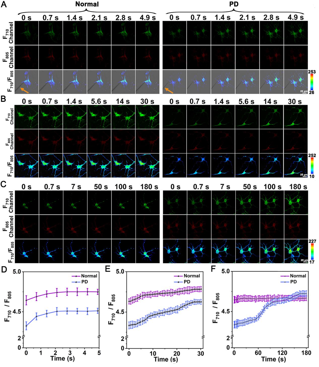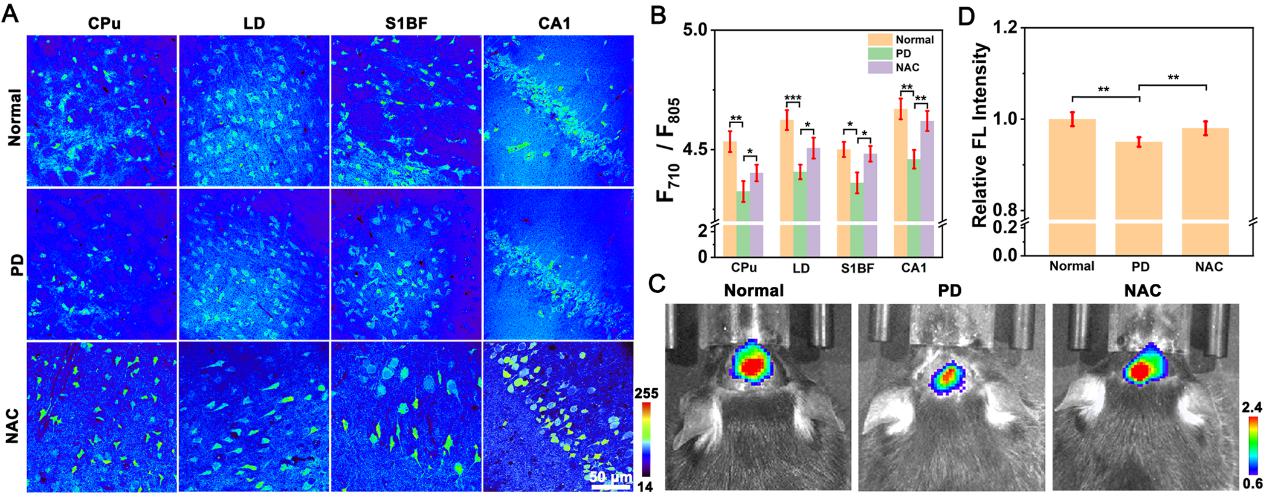 基于探针对NE响应的高特异性、高灵敏度、高时间分辨率以及近红外比率型响应等优异性能,课题组进一步研究了帕金森症模型组活神经元中内源性NE 的超快动态、定量荧光成像,分别追踪了在外部电流、高钾离子和抗氧化剂药物等不同刺激、不同模型下神经元中NE浓度的实时响应情况(图3)。结合急性脑切片和活体鼠脑中NE水平的动态变化研究,揭示了NE与帕金森症病理之间的密切相关性,证实了帕金森症鼠脑中NE的含量显著低于正常组,而抗氧化药物N-乙酰半胱氨酸(NAC)的治疗,有助于NE水平的恢复(图4),这为帕金森症病理机制和药物作用机制的解析提供了实验支持。