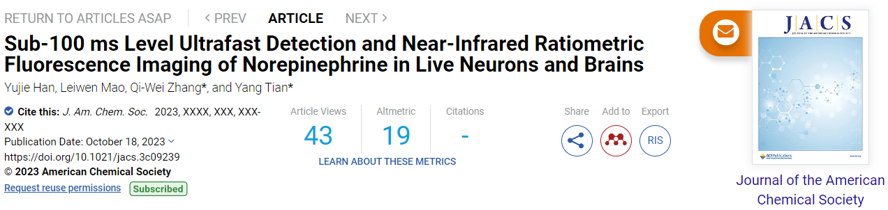 去甲肾上腺素(Norepinephrine,NE)是中枢神经和交感神经系统中关键的儿茶酚胺类神经递质之一,它能够通过快速动态的释放/结合过程介导神经元信号传递、情感调节和影响器官功能。NE水平的失衡与许多神经退行性和精神疾病密切相关,如阿尔茨海默病(AD)、帕金森病(PD)等。然而,由于生物体中NE含量与分布的动态性和瞬时性(ms-s),目前仍然缺乏有效的分子探针对其进行实时、快速、精准的动态监测和定量荧光分析。