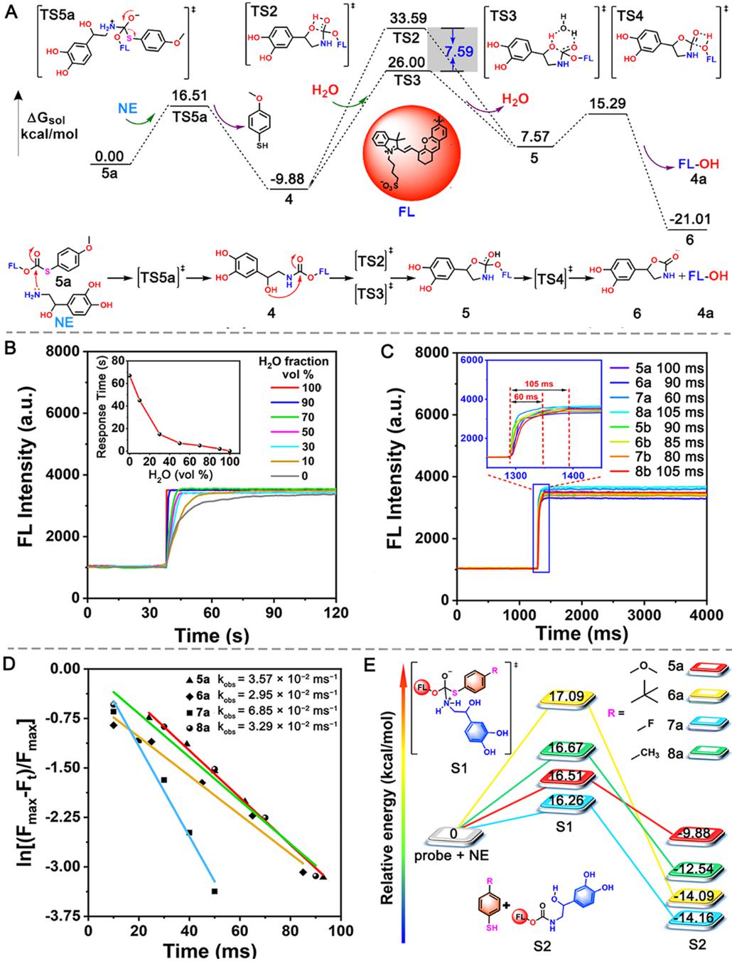 针对探针表现出的超快响应特性,课题组系统分析了探针分子的亲水性、离去基团活性、取代基电子效应,以及反应位点的空间位阻效应等对识别反应动力学的影响。对反应历程的理论计算表明,水分子可以参与识别反应并形成一个六元环过渡态,促进了分子间质子转移过程,有效降低了反应能垒(图2A)。实验结果也证实了探针在纯水环境下比无水环境下反应速率提升约680倍(图2B)。研究发现,离去基团苯硫酚的对位取代基(甲氧基、叔丁基、氟和甲基)可以进一步调控反应速率,具有强吸电子特性的氟取代探针具有最快的反应动力学(图2C,D)。这是由于吸电子基团可以进一步增强反应位点羰基碳的亲电性,从而使氨基的亲核过程具有更低的反应能垒,促进反应的进行(图2E)。