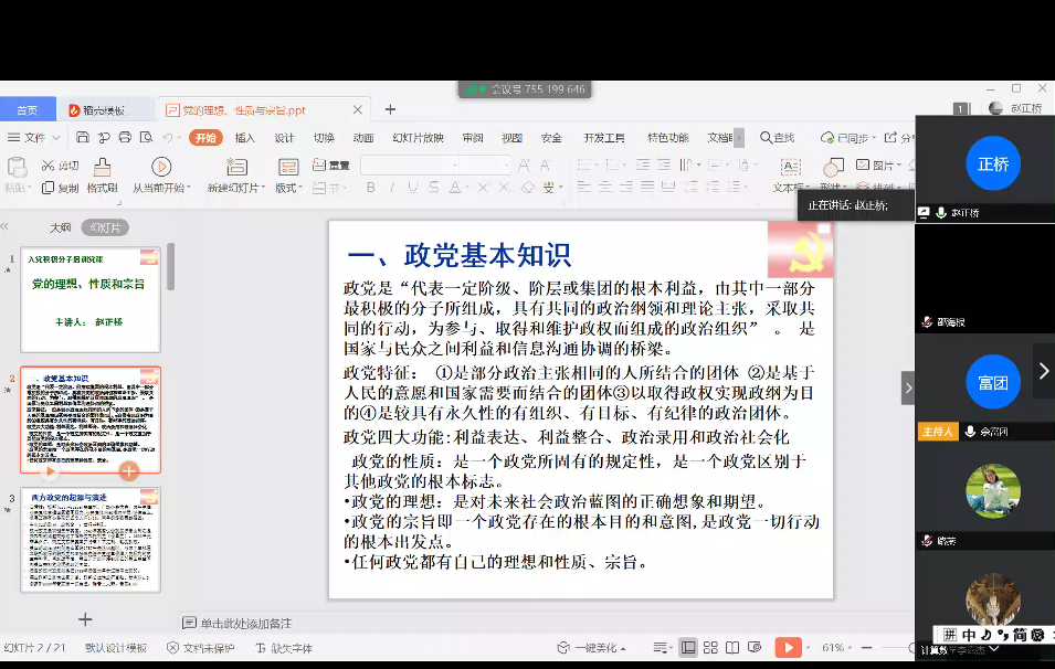 2020年5月5日下午1时许,由av大平台 党委(以下简称化学院)主办,物理与电子科学学院党委、通信与电子工程学院党委、数学科学学院党委、哲学系党委、生态与环境科学学院党委、河口海岸科学研究院和河口海岸学国家重点实验室党委协办的2020年第一期入党积极分子联合党校培训班以“云上党校”的形式迎来了第六次主题讲座,本次党课讲座由数学科学学院党委副书记余富团主持,av大平台 政治学系党委书记赵正桥受邀主讲《党的理想、性质与宗旨》。