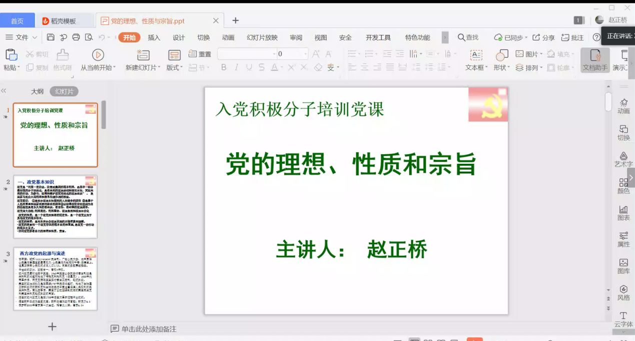 赵正桥老师首先从政党的定义、特征、性质、理想和宗旨等方面介绍了政党的基本知识,介绍了西方政党的起源和演进,以及中国历史进程中的各类政党概况。随后,讲座进入正题,主要有三大部分,分别是“中国共产党的理想”、“中国共产党的性质”和“中国共产党的宗旨”。