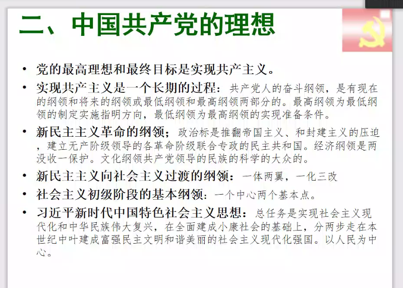 中国共产党的最高理想和最终目标是实现共产主义。共产主义社会的基本特征是社会生产力高度发展,物质财富极大丰富,社会成员共同占有全部生产资料。赵老师强调,实现共产主义是一个长期的过程,不同时期的纲领有所区别,共产主义理想与“天堂梦”也有着本质区别:宗教讲的“天堂梦”都是虚无的,强调的都是未来或者前世的事情,但是共产主义是唯物主义的,强调以人民为中心。