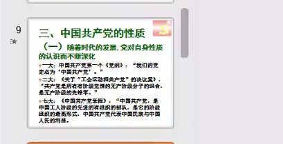在介绍中国共产党的性质时,赵正乔老师指出:随着时代的发展,党对自身性质的认识不断深化,不断增强党的阶级基础和群众基础是坚持党的性质、完成党的历史使命的必然要求,是适应社会阶层结构新变化的客观条件。准确理解与把握党的性质的四个关键词是“两个先锋队”、“一个核心”、“三个代表”和“最高理想”。