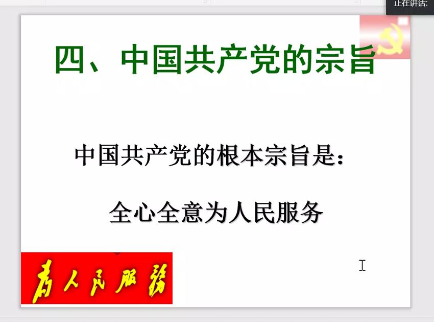 中国共产党的根本宗旨是全心全意为人民服务。赵正桥老师介绍了这一宗旨的提出与确立的过程,他还讲到“为人民服务”提出之前,共产党也是有宗旨的,体现在《共产党宣言》中:过去的一切运动都是少数人的或者为少数人谋利益的运动;无产阶级的运动是大多数人的、为绝大多数人谋利益的独立的运动。此外,赵老师还讲到如何理解与践行“为人民服务”:1.权力来自人民的让渡;2.甘当“公仆”;3.正确处理利益关系;4.防止“为人民服务”吃亏和“为人民服务”已经过时的两种错误倾向。