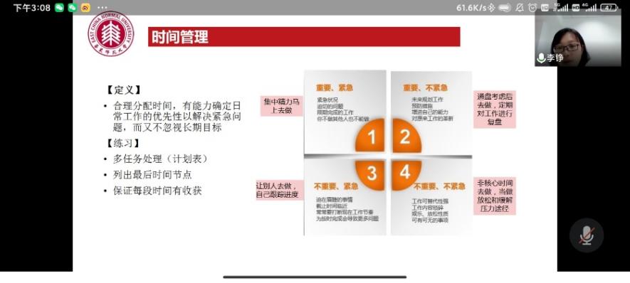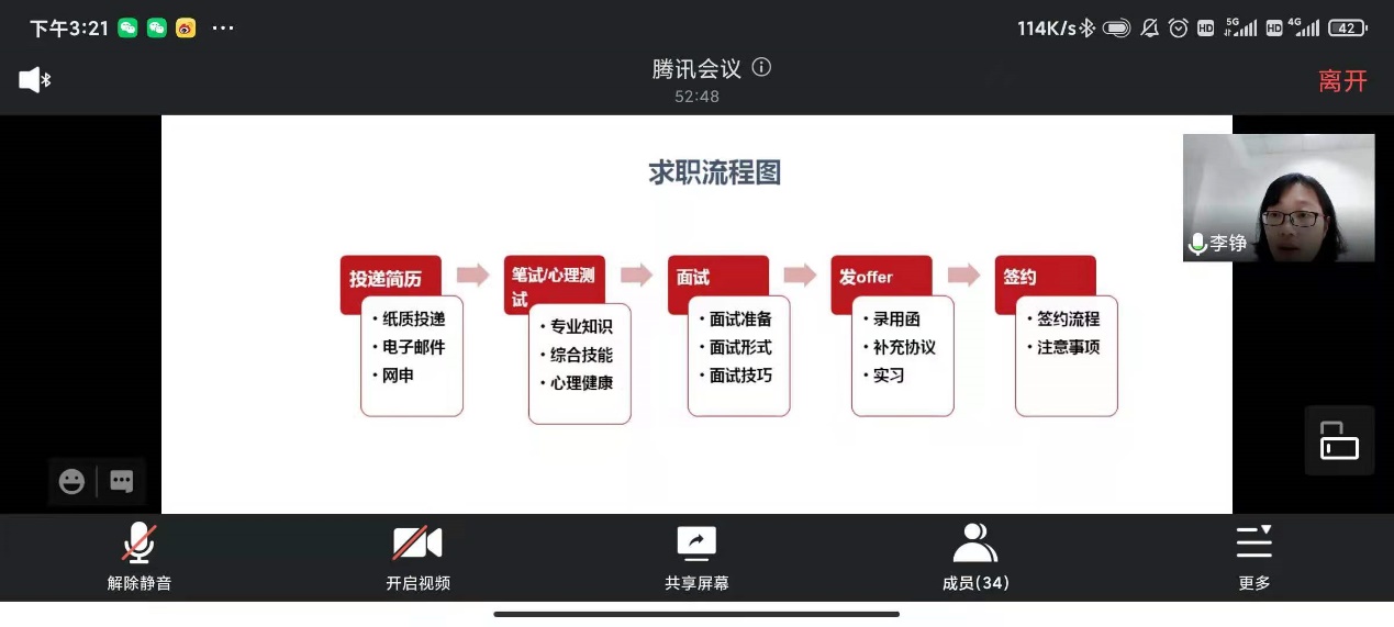 5月19日14:30,av大平台 于线上开展了一场求职指导与就业政策解读讲座,讲座由校学生发展中心生涯指导主管李铮老师主讲,院毕业班辅导员冯琪老师主持,两校区同学共同聆听。