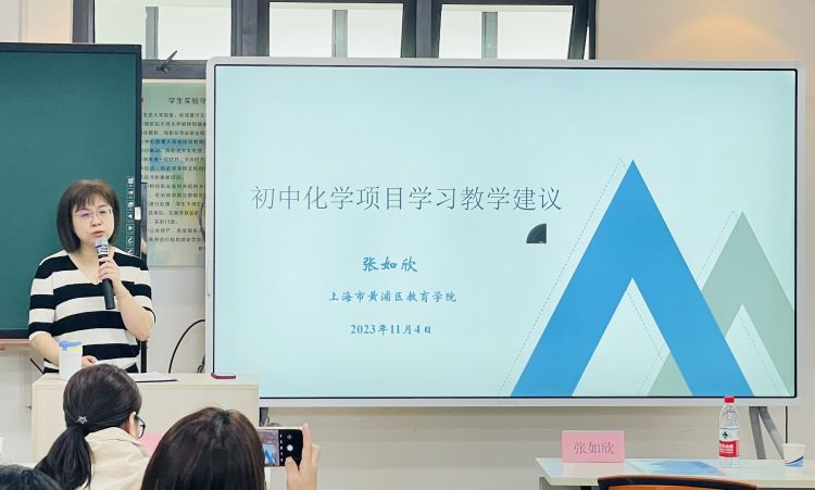 基地还邀请到黄浦区教育学院初中化学教研员张如欣老师作专题报告,作为2022年义务教育化学课程标准颁布后,上海初中化学教材的核心作者之一,张老师主要从如何开展项目化学习、如何进行跨学科设计、如何在项目化学习实施的三个不同维度阐述了“初中化学项目式学习教学”的相关建议,凸显化学核心素养,逐步渗透学科育人思想。报告的最后张如欣老师提出“向未来而教,向未来而学”观点,希望学员们能够有终身学习的意识,用所学所思丰富化学课堂,激发学生产生学习化学的内在驱动力。