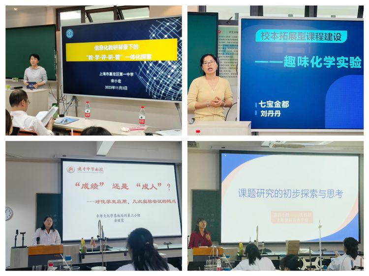 受到本次培训专家、教授专题报告的启发,再结合学员们的教学实践,利用短暂的午休时间第一天学员“破冰”活动和第二、第三天学习交流活动,其中来自中学一线教师代表宋小宏、刘丹丹、金丽霞和沈书君四位老师分别从教研组建设、课程建设、有关化学史实验设计和课题研究探索与思考这四个不同研究视角分享他们的研究经验和成果。培训即将结束之际,卫晨菲、张笑颖、沈健、唐珠四位教师代表分别向基地领导和全体学员以微报告形式总结这三天培训,汇报内容涉及教学观,课堂教学实践研究、化学教师专题研修学习感悟、初中化学课堂多维创新实践研究等内容,这不仅展示了学员们在基地培训学习后获得的累累硕果,又是他们思索教学实践提升自身专业发展而获得的宝贵财富。