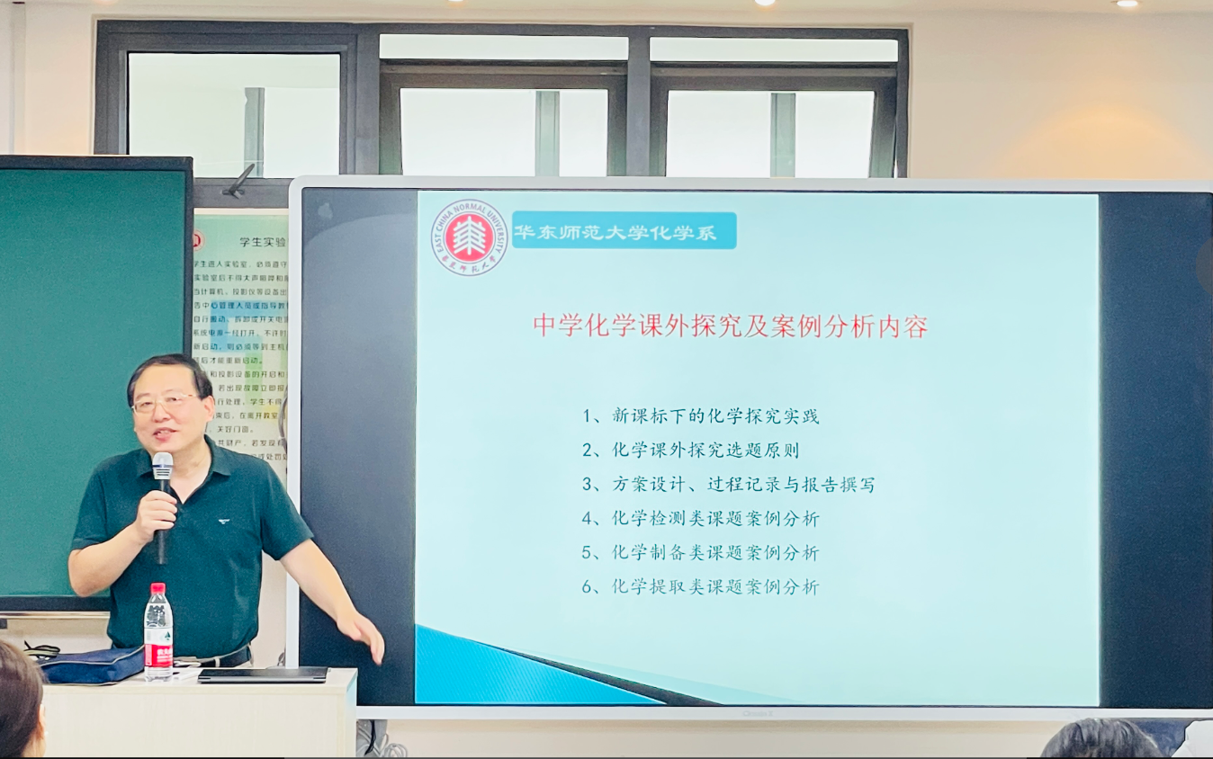 在专家讲座板块,学院邀请了多位教师为学员进行学术报告。徐林教授的报告《超限制造流动化学》介绍了通过超限制造将传统的化工工厂转化为一个超现实的微型化、绿色化化工工厂;张利东教授的《水凝胶柔性传感器助力脑机接口发展》报告中理论与实例相结合阐述了如何通过探究影响水凝胶柔性传感因素,创新突破人工AI壁垒技术;王欢教授的《碳中和与绿色碳科学》报告介绍了“绿色碳科学”内涵,凸显从纯粹理论知识到工厂实际生产的跨越式发展;陈启明教授《慧眼看世界》的报告从量子思维视角带领学员们重新认识化学学科的特征和思维的特点,感受到化学学科核心知识的独特魅力;王清江教授作《中学化学课外探究选题及案例分析》报告中指出中学生课外探究课题选题的一般原则,结合具体实例介绍课题选题和书写报告中应注意的相关问题;《化学教学》执行主编吴敏编审从期刊论文编审的视角,分析目前中学化学教师在论文写作上存在的主要问题,深入浅出阐述论文撰写的关键要素,搭建出一座促进一线教师由学习型转变成研究型教师的“桥梁”。讲座内容用前沿知识抛砖引玉,内涵丰富深刻,学员们收获满满。