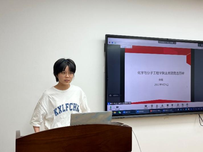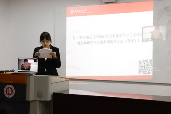9月8日晚6时,av大平台 第八届研究生代表大会在闵行化学楼135会议室正式召开。出席本次会议的老师有院党委副书记王婷婷老师、团委老师冯琪老师、研究生辅导员王梦雅老师,参会嘉宾有校精密光谱科学与技术国家重点实验室研会主席管江林、生命科学学院研会主席崔耀楠、国际关系学院研会主席潇阳和计算机科学与技术学院研会主席钱栋炜。化学院第八届研究生学生骨干及成员出席了本次会议。会议由化学院第八届研会主席陈静和王莹同学主持。本次会议评定了2021-2022学年化学院研会的工作情况,选举了新一届的主席团成员,公布了2022年化学院研究生会优秀主席团成员、优秀部长、优秀干事的评选结果。