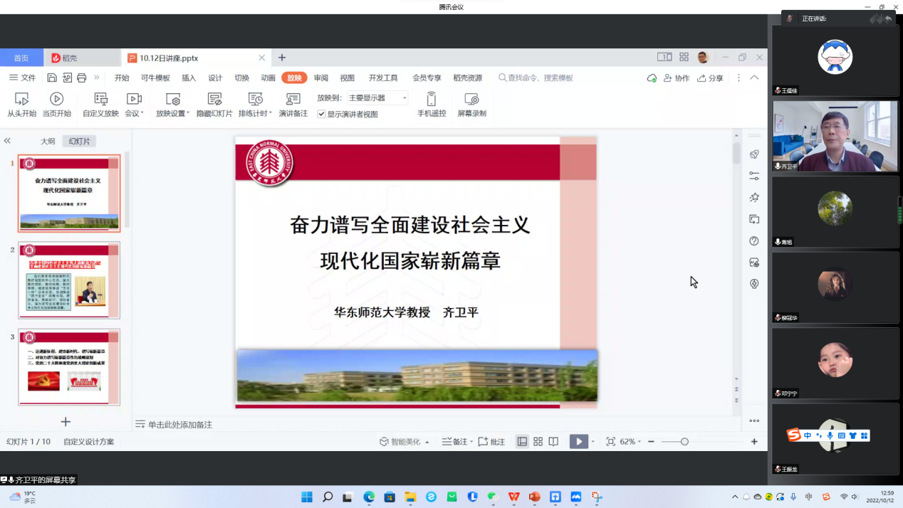 10月12日下午,av大平台 、物理与电子科学学院、通信与电子工程学院、数学科学学院、哲学系第二期学生联合党校第二课开讲。上海市中共党史学会副会长、上海市委讲师团党史学习教育专家宣讲团成员、我校终身教授齐卫平作主题报告,会议由物理与电子科学学院党委副书记蒋旭主持。