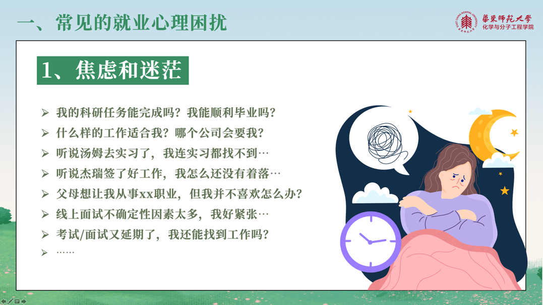 讲座伊始,辅导员王梦雅老师围绕毕业生极易出现的就业心理困扰展开话题,为2023年面临巨大就业挑战的毕业生们分析了常见的就业心理问题。王老师指出,焦虑和迷茫、自卑和自负、盲从和攀比、慢就业心理等逐渐成为常见的就业心理困扰,她用大量的实例向同学们介绍了这些就业心理困扰的具体表现,以便同学们及时察觉自己的负面情绪。