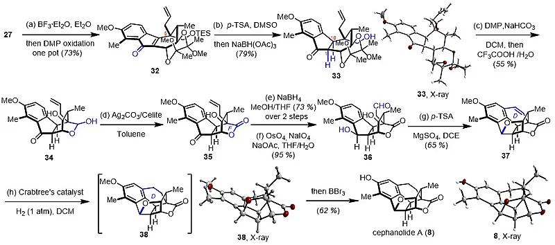Prins环化反应具有普适性,适应于多官能团化合物27,并经过的Prins环化+氧化反应一锅转化得到化合物32(图4)。利用关键的远程羟基导向,对四取代双键进行立体选择性还原,从而实现了C环中6个连续手性中心的构建。针对D−E−F环的构建。通过氧化态调整,实现桥连内酯环(F环)的构建。离子介导的跨环醚化串联Friedel−Crafts环化,一步构筑了D−E环。