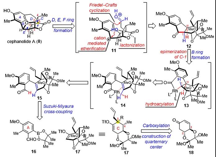 作者采用汇聚式合成策略,从手性前体化合物出发,以15步完成了cephanolide A的全合成。其中立体选择性的化学键形成和阳离子介导的环化反应在合成中发挥了关键作用。这一合成策略可以百毫克级制备cephanolide A,为未来该类家族天然产物及其衍生物的合成奠定了重要的基础。