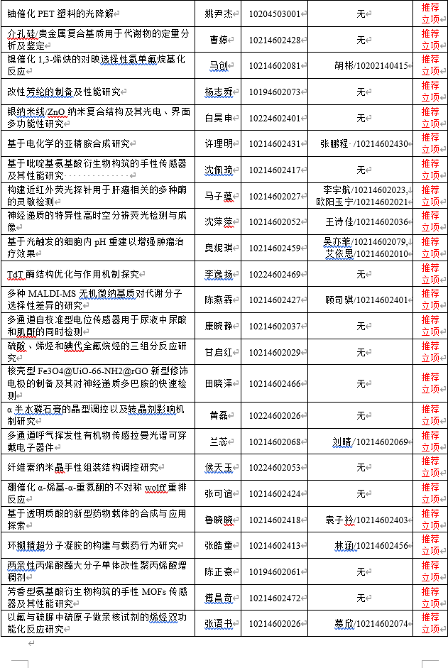 化学院近年来坚持落实学校“卓越育人”的工作方案,以卓越学术建设卓越课程,实现拔尖创新人才的培养。绝大部分参加本年度申报的学生已修过科研训练课程,有的学生已先期进入指导教师课题组,具备了一定的项目基础。大家纷纷对导师在科研上的关心指导表示感谢,并认为在此过程中收获颇多,了解科研中的严谨求实、刻苦坚持、团结合作,永不放弃的精神。