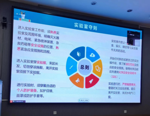 9月7日上午10点,实验室与设备处的孔利利老师在闵行化学楼135会议室开展了2022年新生实验室安全教育,中北校区的新生同学们于化学馆A205会议室同步观看。其目的是提醒同学们对实验室保持敬畏之心,只有将实验室安全规范牢记于心、防范于未然,才能营造安全的实验环境。