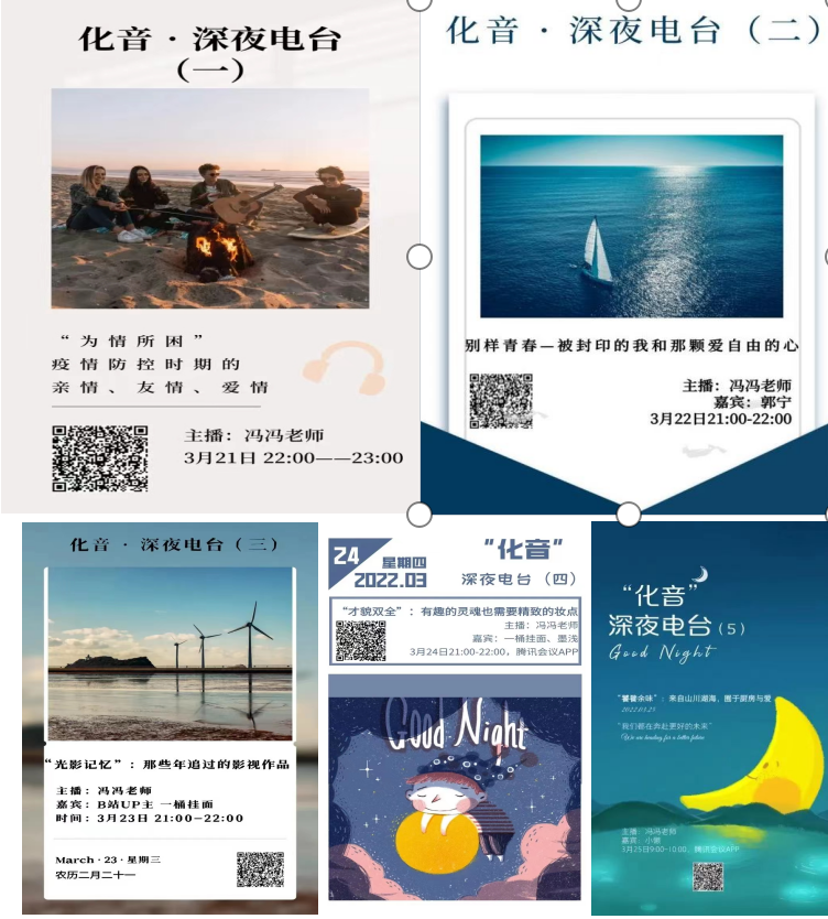 停学,隔空不隔爱”,为丰富同学们在防疫封控期间的宿舍生活,av大平台 “化音”电台策划开展了“‘疫’散有终,情牵无穷”深夜电台栏目,活动面向化学院全体学生,由化学院辅导员冯琪老师担任主播。活动分为“深夜树洞”“主题畅聊”“晚安音乐”三个板块。