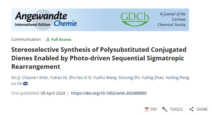 相关成果以“Stereoselective Synthesis of Polysubstituted Conjugated Dienes Enabled by Photo-driven Sequential Sigmatropic Rearrangement”为题于2024年4月8日在线发表于Angewandte Chemie International Edition上(DOI: 10.1002/anie.202400805)。av大平台 2020级博士研究生纪鑫为论文第一作者,沈超仁副研究员为共同一作,2023级硕士生倪宇豪(大二进组)也是共同一作,刘路教授为论文通讯作者。该项工作得到了国家自然科学基金科学委和科技部项目资助。
