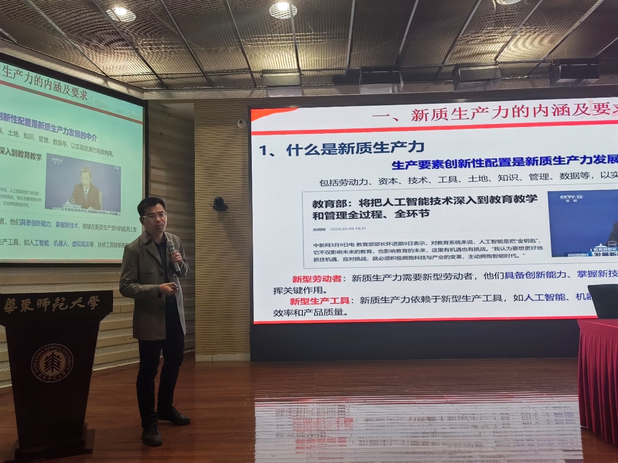 接着,av大平台 挂职副院长、贵州六盘水师范学院化学与材料工程学院院长雷以柱教授为学员们进行首场讲座,报告主题为“深刻把握新质生产力的内涵及要求,为推动高质量发展贡献高校力量”。雷老师结合自身教学和科研的相关工作,深刻阐释了新质生产力的内涵及要求,以及高校在锻造新质生产力方面的应有之力。他特别讲到,高校是发展新质生产力的重要力量和关键路径,鼓励参训学员,心怀“国之大者”,抓住师大的宝贵环境,在学习科研和生活中提高自身综合素质和创新能力,做“与国家民族同呼吸共命运”的“强国一代”。