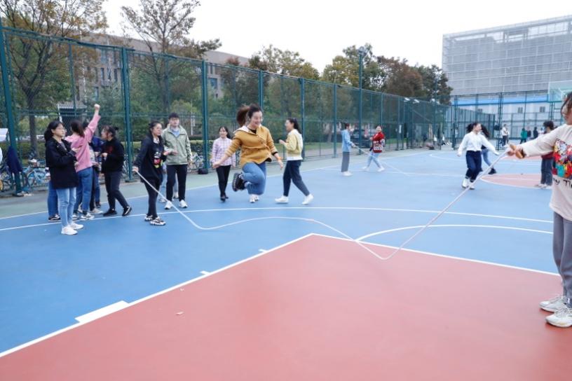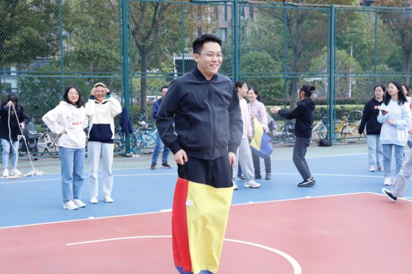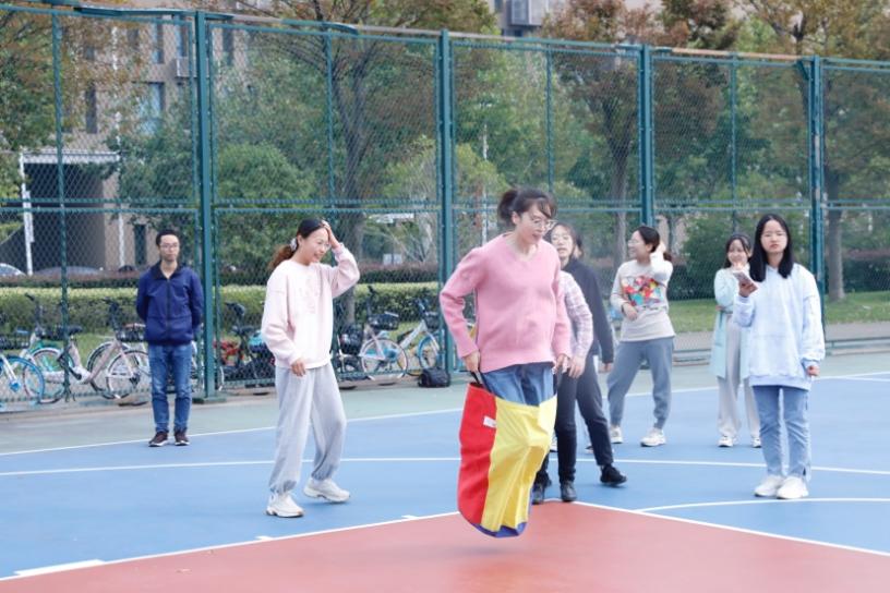 在“袋鼠跳”项目中,师生采用迎面接力形式,双脚套在袋子中跳跃前进,按完成时间进行排名,其中紫队一马当先,拔得头筹。