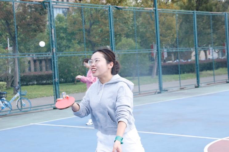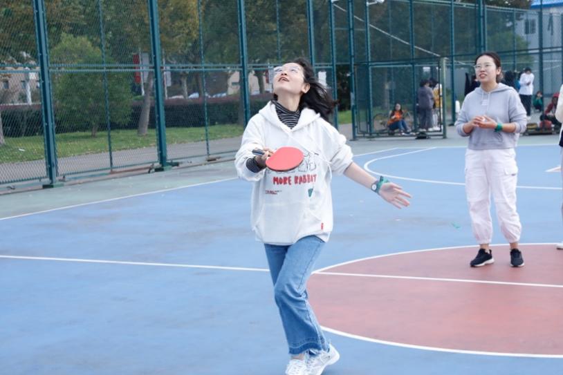在“乒乓球接力赛”中,每队六名队员采用迎面接力形式,单手用乒乓球拍运送乒乓球,依次完成接力,紫队再次拔得头筹。
