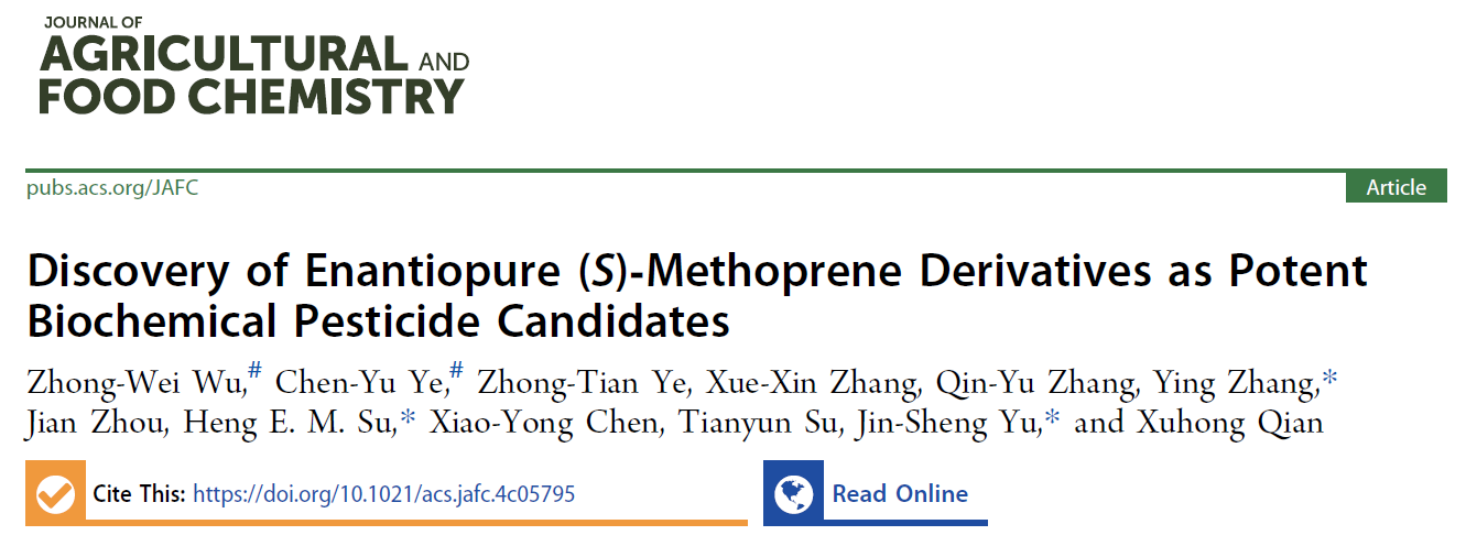 相关成果以“Discovery of Enantiopure (S)-Methoprene Derivatives as Potent Biochemical Pesticide Candidates”为题,于2024年10月23日在线发表在Journal of Agricultural and Food Chemistry上(DOI: 10.1021/acs.jafc.4c05795)。av大平台 为论文第一完成单位,av大平台 博士研究生吴忠伟和生态与环境科学学院硕士研究生叶晨誉为共同第一作者,余金生教授、张颖副教授和苏衡特聘教授为共同通讯作者。研究工作得到论文共同作者钱旭红院士、av大平台 周剑教授、生态与环境科学学院陈小勇教授和美国EcoZone International苏天运教授的悉心指导与鼎力支持。本研究得到国家重点研发计划、上海市科技创新行动计划农业科技领域项目、辽宁省自然科学基金、教育部和中央高校基本科研业务费专项资金等经费支持,还特别得到华东理工大学李忠教授、邵旭升教授和徐晓勇教授、南开大学范志金教授和av大平台 周锋教授等的大力指导与帮助。