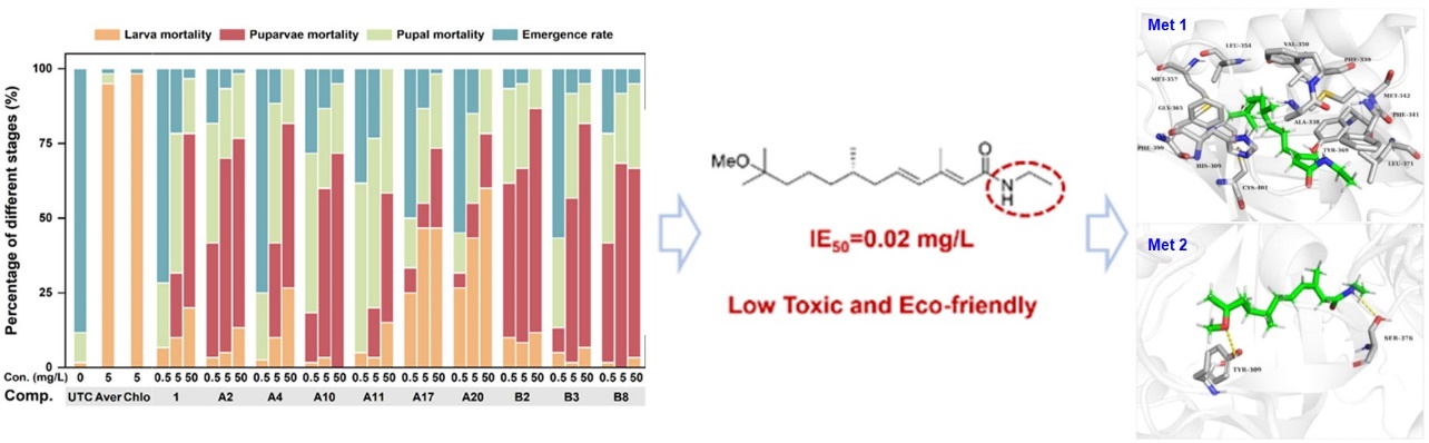 近期,在钱旭红院士带领与指导下,av大平台 、上海分子治疗与新药创制工程技术研究中心余金生教授团队与生态与环境科学学院张颖副教授团队和常州胜杰生命科技股份有限公司苏衡董事长团队等跨学科合作,通过对S-烯虫酯这一商业化成功的生物化学农药进行生物合理性的结构改造与优化,设计合成了系列包含酯类和酰胺类的S-烯虫酯类似物候选库;在系统评估其对小菜蛾和苜蓿蚜两类农业害虫的生物活性后,发现S-烯虫酯衍生的乙酰胺对小菜蛾具有很好的羽化抑制活性(IE50 = 0.02 mg/L),甚至高于常规划学农药和生物农药。进一步结合化合物理化性质预测、毒理学评估和分子对接等研究,表明S-烯虫酸乙酰胺具有发展成为防治鳞翅目害虫的生物化学农药候选产品的很大潜力。值得一提的是,这是S-烯虫酯类化合物在农业害虫防治领域的首次成功探索。