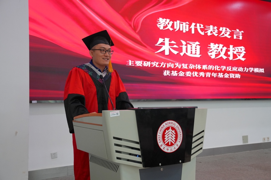 教师代表朱通教授回忆了自己十年前毕业的场景,以结构和量子化学的基础知识为喻,勉励毕业生们面对人生要自信、要勇敢;面对生活要从容、要冷静;面对生活要有情怀、有心胸。最后,朱老师寄语毕业生能够自信、从容、勇敢地创造光明的未来。